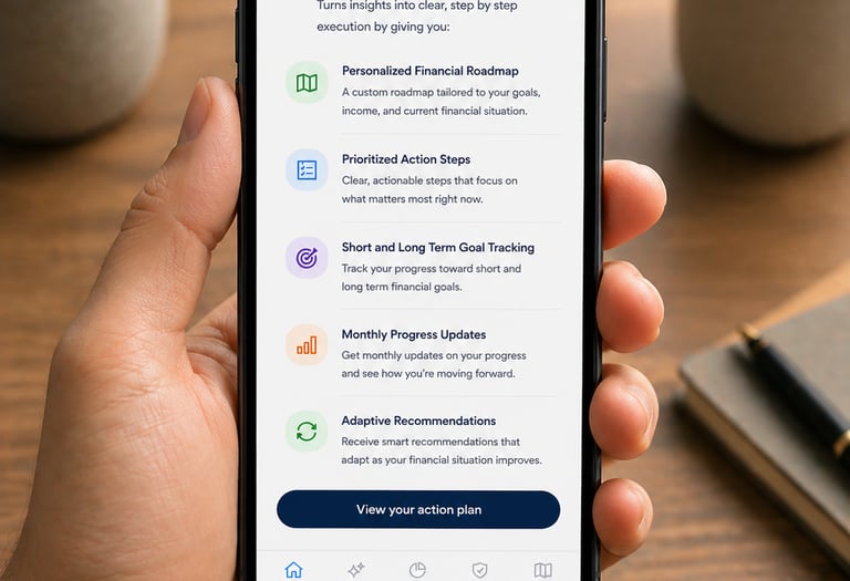 Using your Financial Identity Score, behavioral data, and long term objectives, our system builds a personalized timeline that prioritizes the right actions at the right moments. Whether it is improving your credit, reducing debt, increasing savings, or growing investments, every step is clearly defined and aligned with your goals.